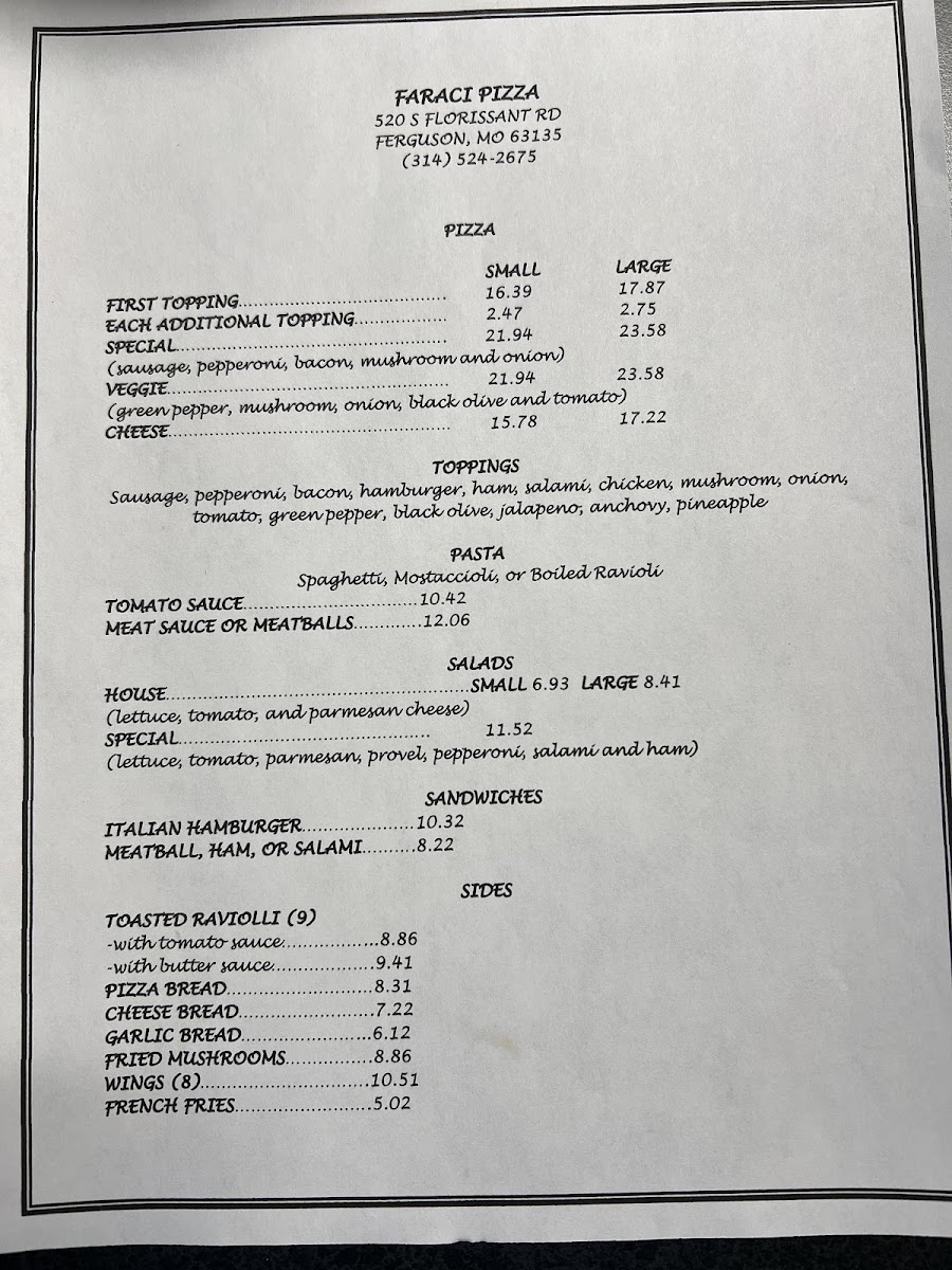 The menu features timeless favorites like the Faraci Special Pizza, loaded with sausage, pepperoni, bacon, mushrooms, and onions, alongside simple options such as pepperoni or cheese pizzas. For those looking for something a bit different, there are choices like the vegetarian pizza with fresh mushrooms, onions, tomatoes, green peppers, and black olives, or bold flavor combinations like jalapeno and pineapple. Beyond pizza, the menu includes popular local bites such as toasted ravioli and baked ravioli, as well as hearty sandwiches and fresh salads.